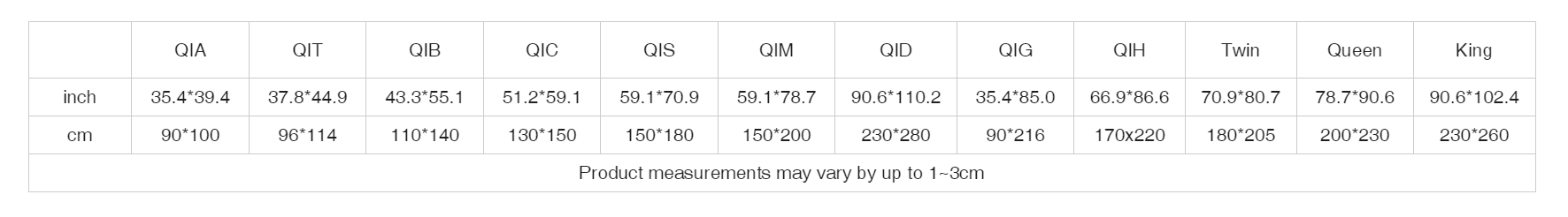 | cm | 90*100 | 96*114 | 110*140 | 130*150 | 150*180 | 150*200 | 230*280 | 190*216 | 170x220 | 180*205 | 200*230 | 230*260 |