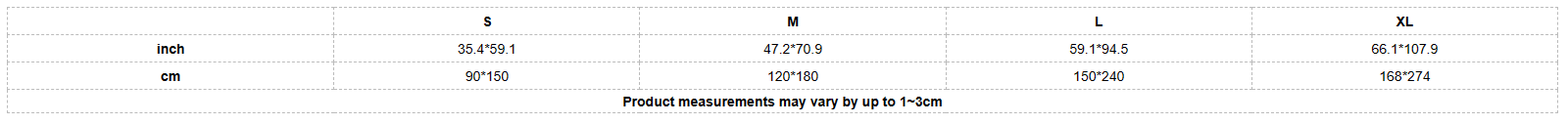 | cm | 90*150 | 120*180 | 150*240 | 168*274 |
