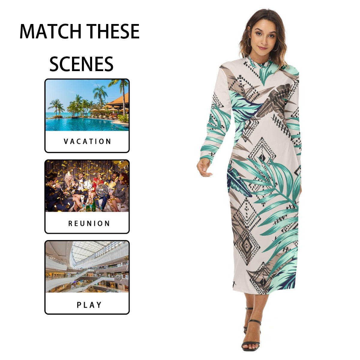 Ptahra B Light Beige/Green Leaf/Diamond Pattern Women's Hip Dress