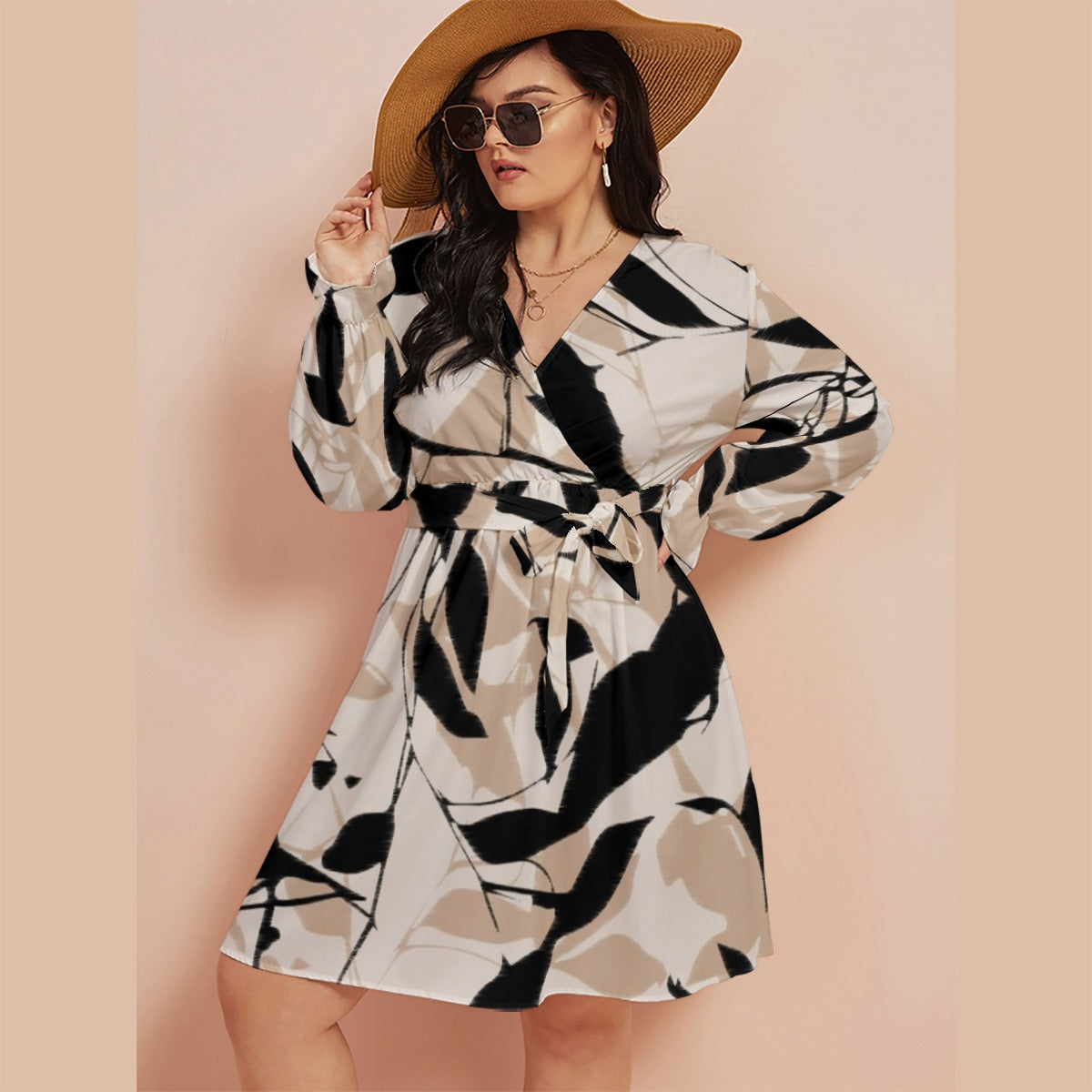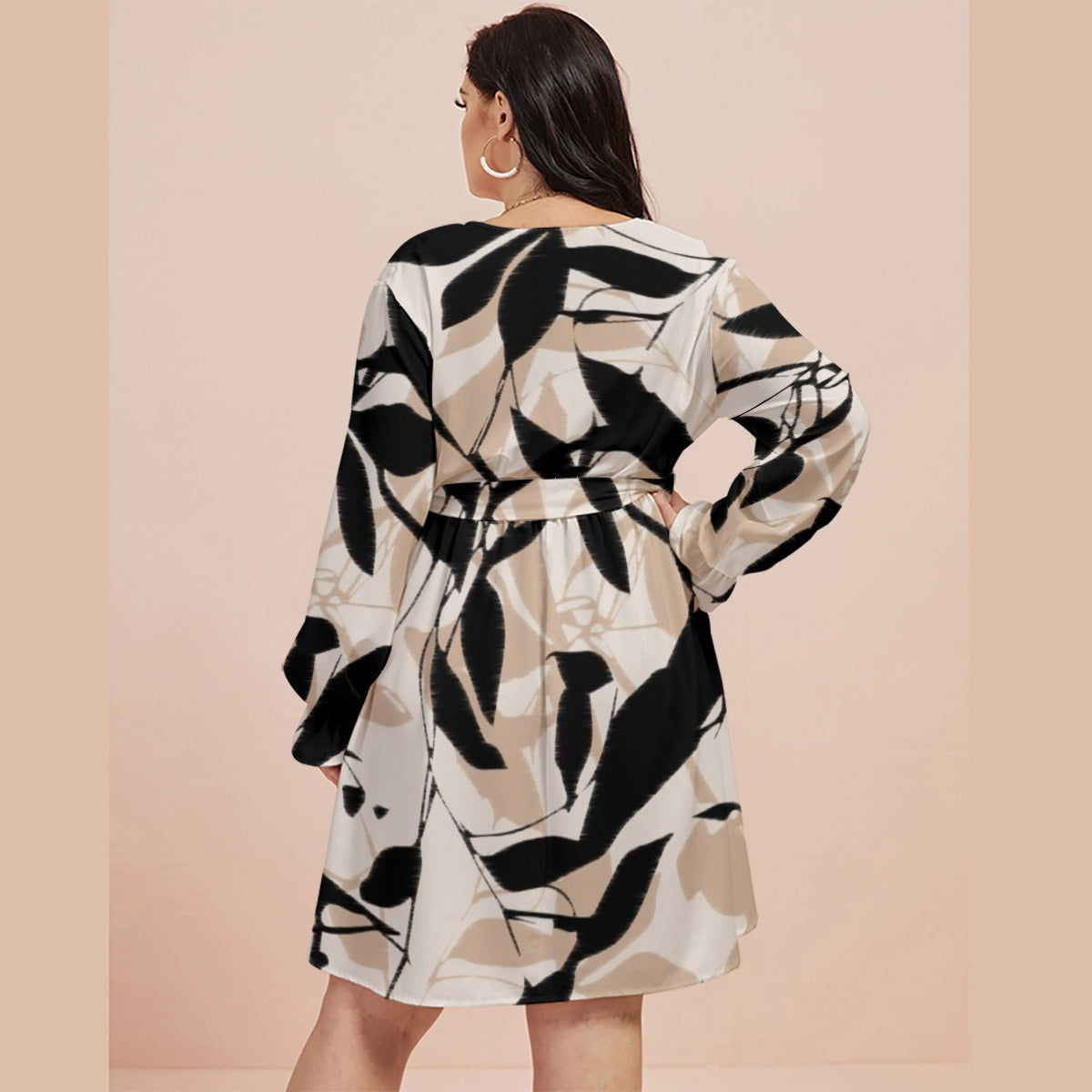 Ptahra B Women's Black/Beige Leaf V-neck Dress with Waistband