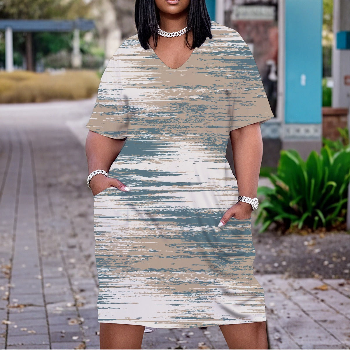 Ptahra B Women's Blue/Brown/White Swish Paint V Neck Short Sleeve Dress/Plus Size