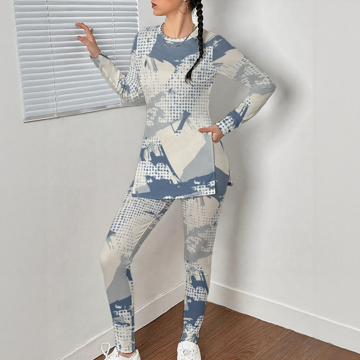 - Round-neck, long slevees, oversize top with split design, and comfortable pants