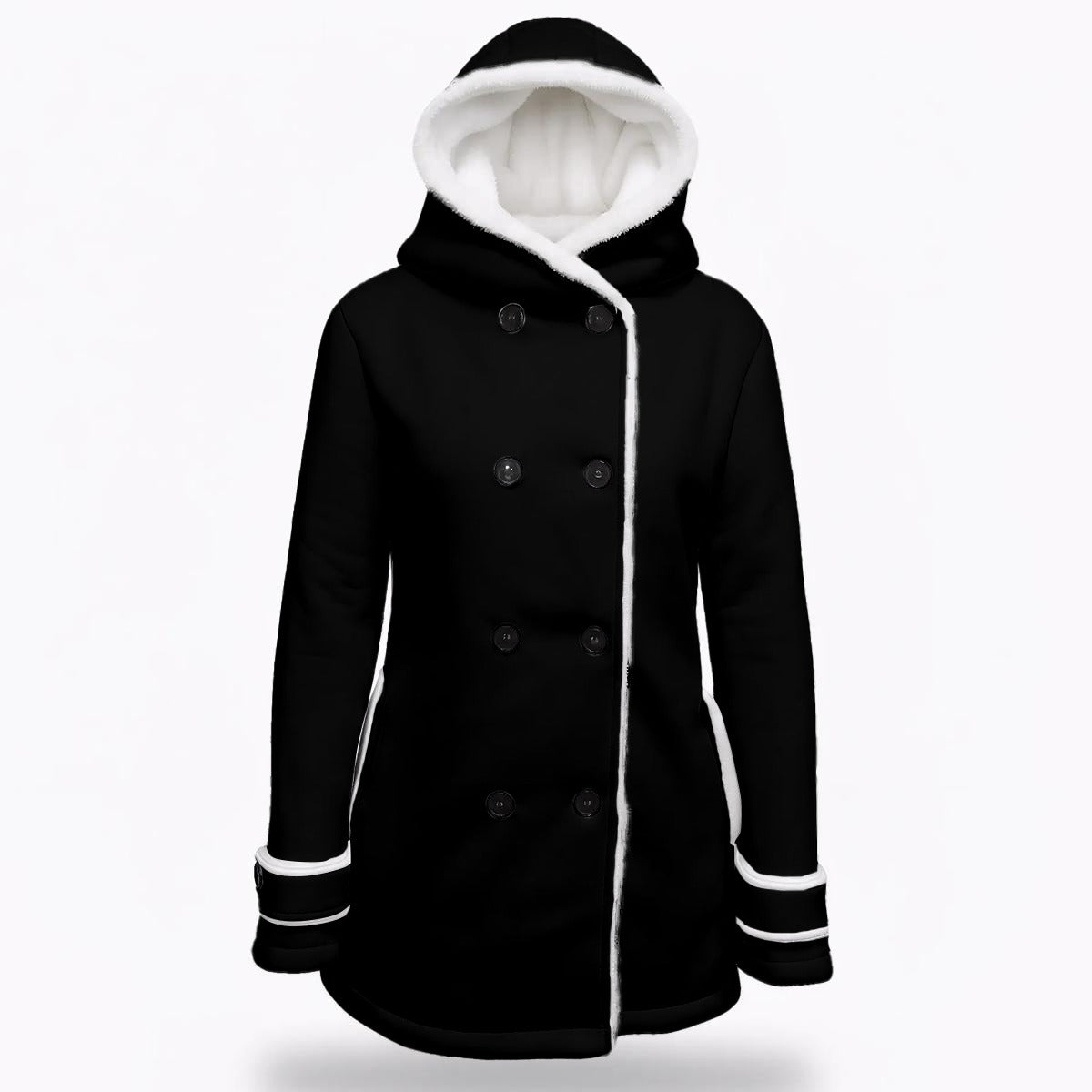 Ptahra Women's Black Hooded Double-Breasted Winter Coat With Fleece